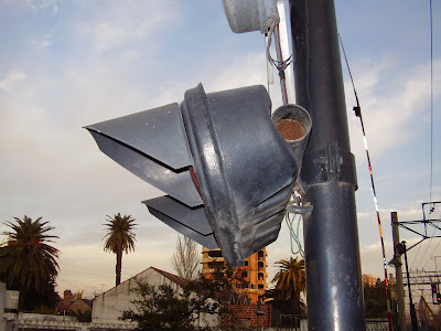 3 fotos del paso a nivel 9 de julio, ciudadela. en la 1º foto vemos el cruce completo. en la segunda, podemos ver la barrera lado sur baja (por falla en el mecanismo), y recientemente "reparada" (solo la punta). en la 3er. foto, podemos ver el repuesto de la punta preparado para ser colocado en la barrera del lado norte.